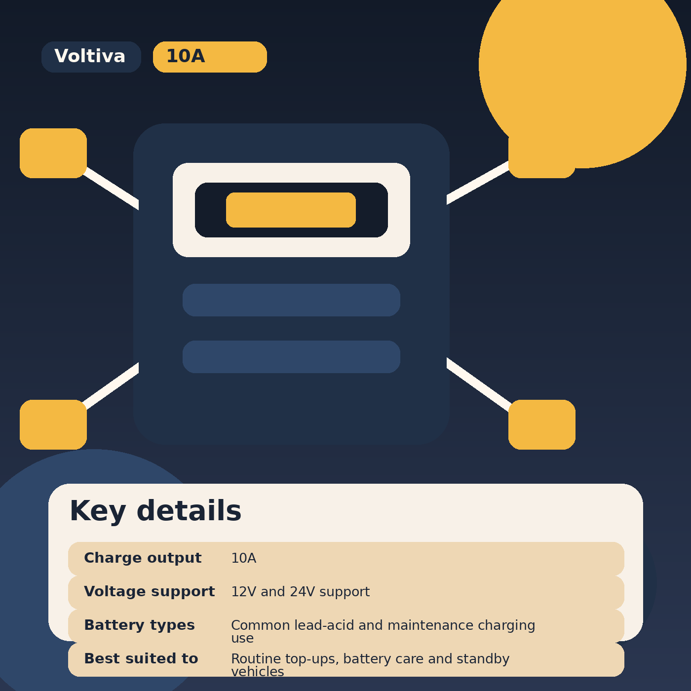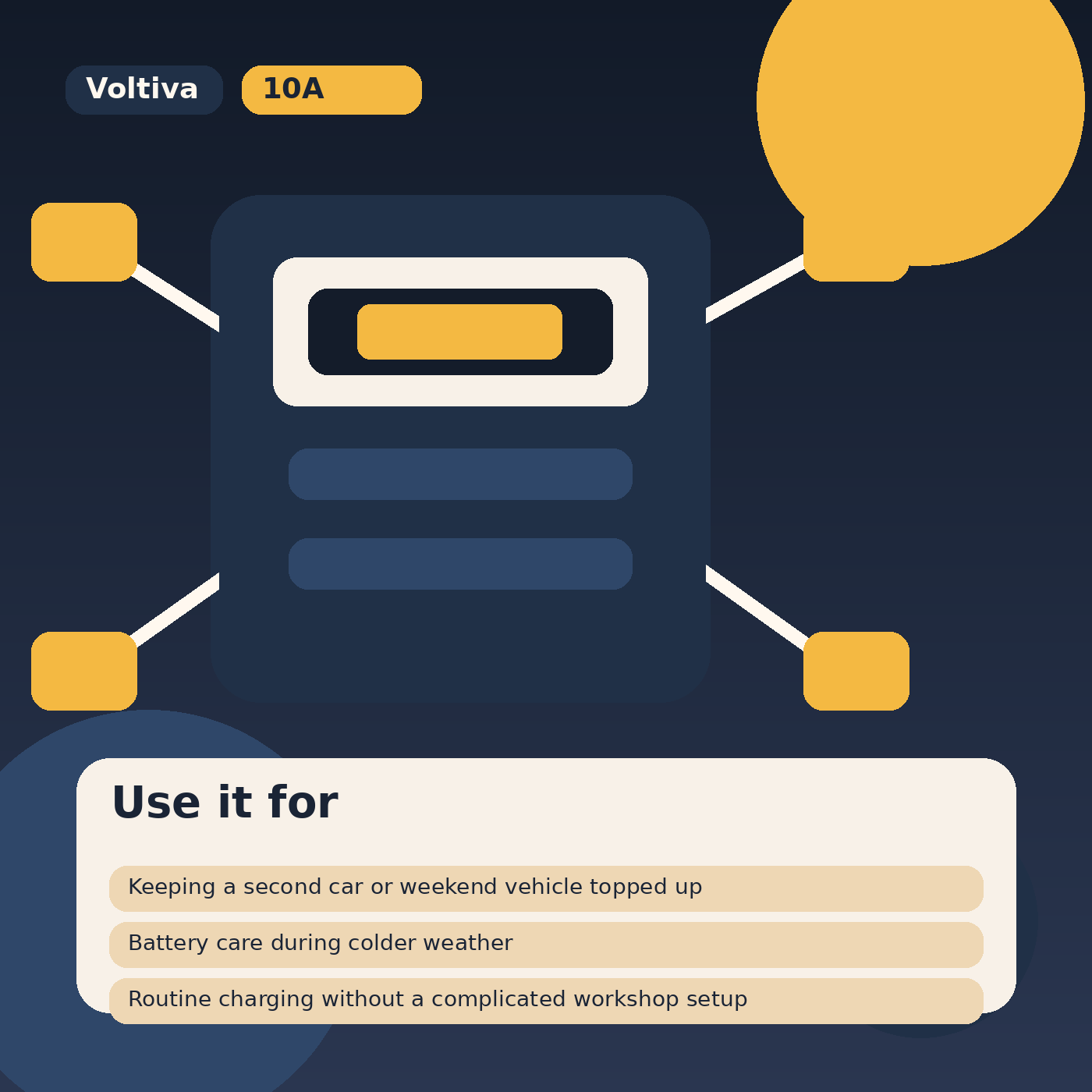 A sensible charger for home use. I wanted something straightforward for seasonal battery care and this fits that role well.